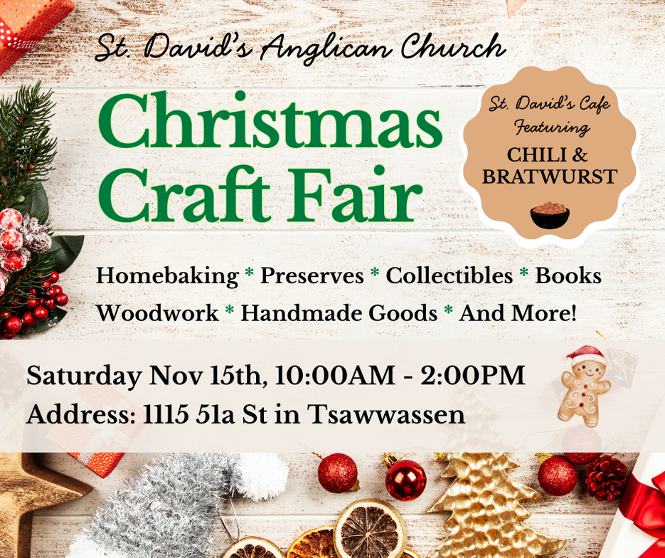 Come on out to St. David's Christmas Craft Fair. Do a bit of gift shopping, then take a break and enjoy chili and bratwurst for lunch!