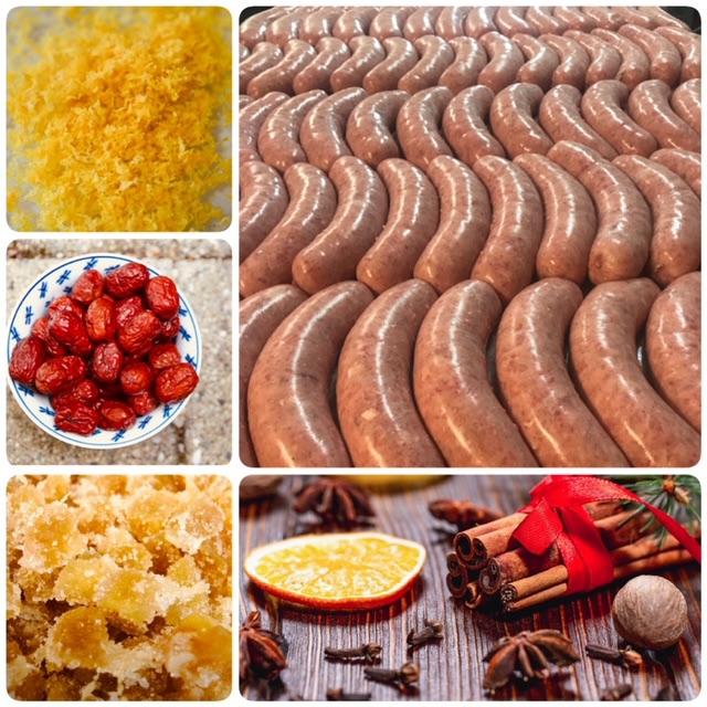 Alsatian Christmas Sausage is a fine grind sausage made in the style of a bratwurst but strongly flavored with gin soaked red currants, candied ginger, orange zest and Christmas mulling spices of cloves, nutmeg, allspice & cinnamon!