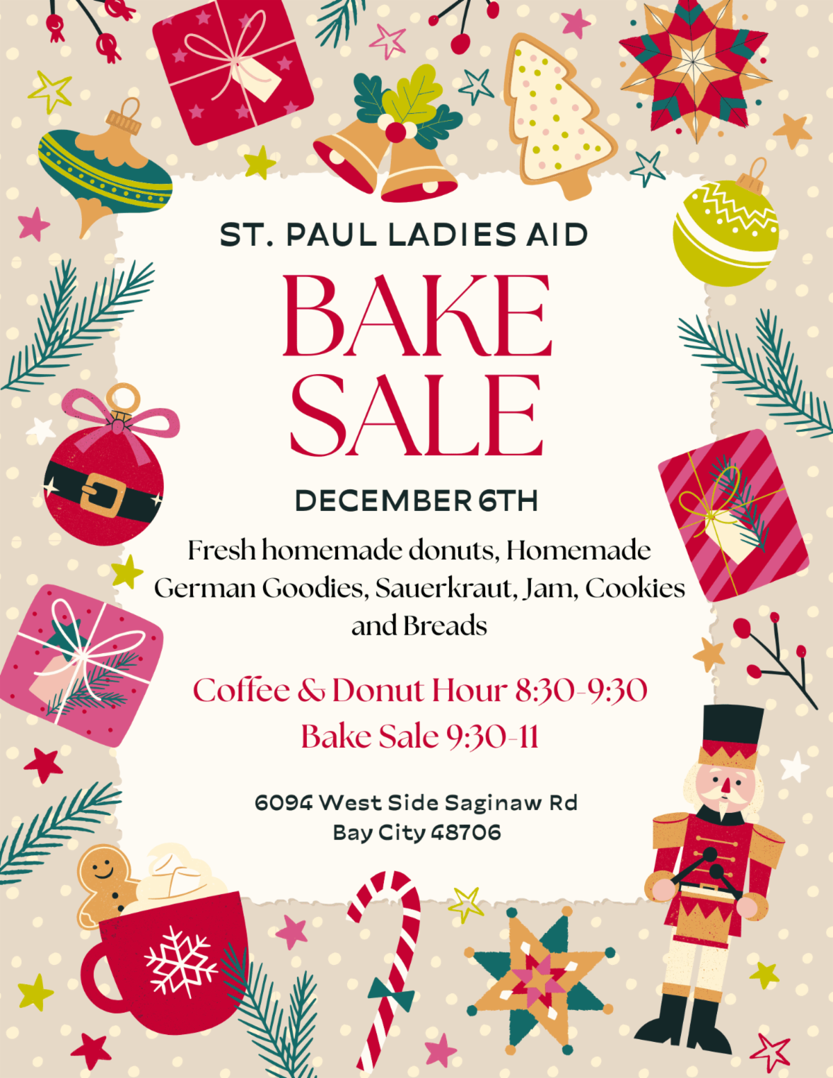 The St. Paul Ladies Aid will be having a donut hour and bake sale this year on Saturday, December 6, 2025. Donut hour will be from 8:30 a.m. - 9:30 a.m., with the bake sale starting at 9:30 a.m. until 11 a.m. We plan to have all of our traditional German treats including Eisenkuechle, springerle, stollen, butter horns, breads, and sauerkraut. Any congregation members interested in donating baked goods (please drop off to school on Friday December 5 between 8 am and 5 pm) or helping to work the Bake Sale, please contact Diane Behmlander at 989-297-3485, Jennifer Zielinski at 989-450-9805, Clarissa Marter at 989-980-0090 or Christy Swartz at 989-245-0796. Thank you!