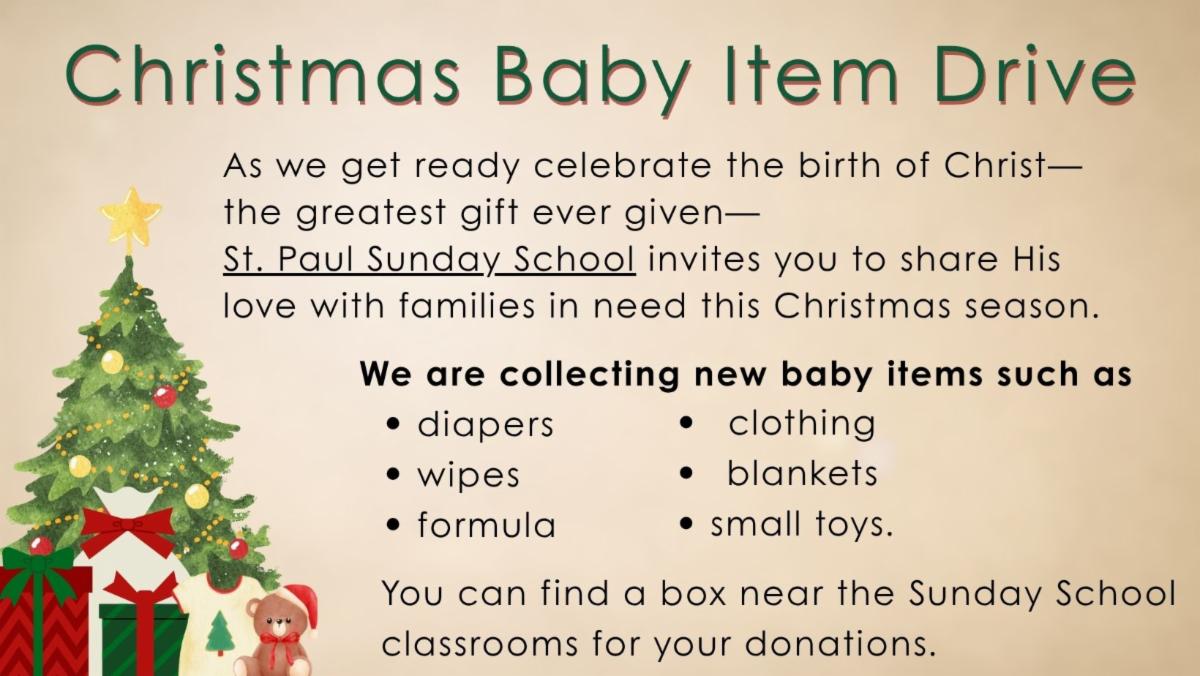 The St. Paul Ladies Aid will be having a donut hour and bake sale this year on Saturday, December 6, 2025. Donut hour will be from 8:30 a.m. - 9:30 a.m., with the bake sale starting at 9:30 a.m. until 11 a.m. We plan to have all of our traditional German treats including Eisenkuechle, springerle, stollen, butter horns, breads, and sauerkraut. Any congregation members interested in donating baked goods (please drop off to school on Friday December 5 between 8 am and 5 pm) or helping to work the Bake Sale, please contact Diane Behmlander at 989-297-3485, Jennifer Zielinski at 989-450-9805, Clarissa Marter at 989-980-0090 or Christy Swartz at 989-245-0796. Thank you!