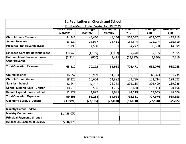 The Board of Business Management would like to share the most recent financials for St. Paul. Please see the image below. If you have any questions, you can contact a member of the Board of Business Management.