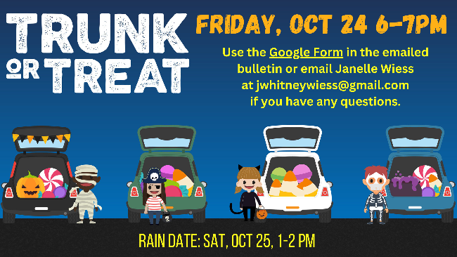 Join us tonight, Friday, October 24, for Trunk or Treat from 6:00-7:00 p.m.