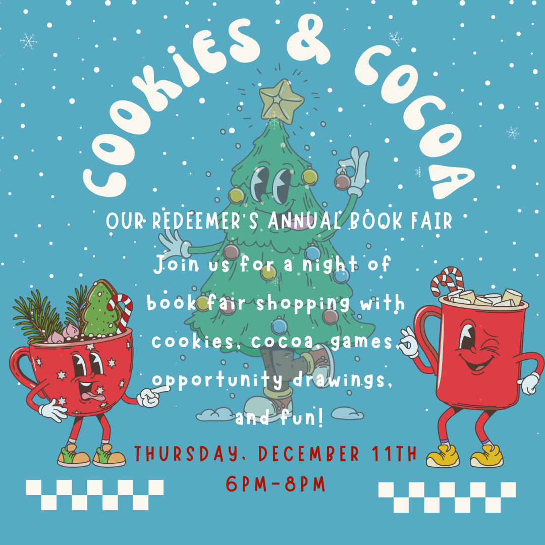We will host a Cookies & Cocoa night on December 11, 6:00- 8:00 pm, as part of our annual book fair. This is a fun-filled night of shopping, games, raffles, Christmas movies, yummy treats, and warm cocoa. It’s the perfect opportunity to do some Christmas shopping while your little ones are entertained.