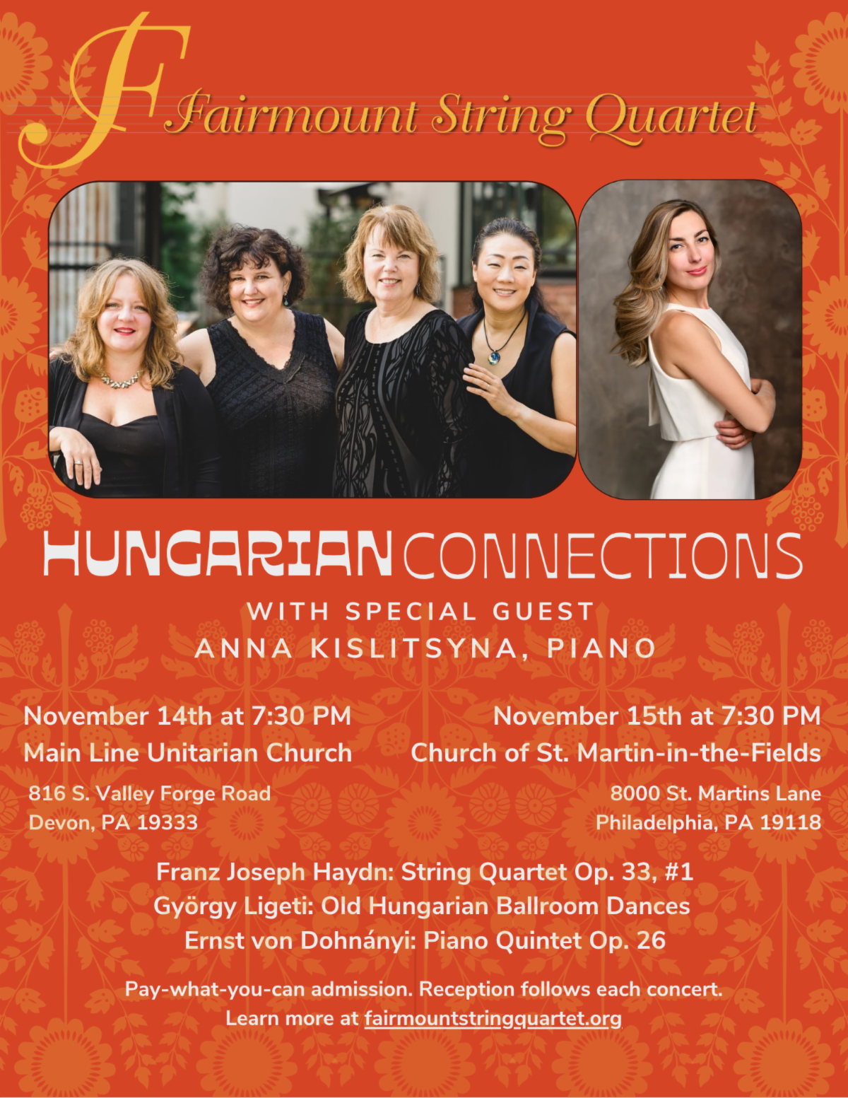 Join our resident ensemble, the Fairmount String Quartet, with guest artist Anna Kislitsyna, on Saturday, November 15th at 7:30 p.m. in the Sanctuary for a program of music with a "Hungarian Connection". The program includes Haydn's String Quartet, Op. 33, #1; Ligeti's "Old Hungarian Ballroom Dances"; and Dohnanyi's mystical and powerful Piano Quintet, Op. 26. It is a program that feels all the feels! Admission is pay-what-you-can and a meet-the-artists reception follows the concert in the Parish Hall. Reserve your spot at fairmountstringquartet.org.