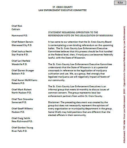 St. Croix County Law Enforcement statement in opposition to legalization of marijuana. Scroll down to Page 2.
