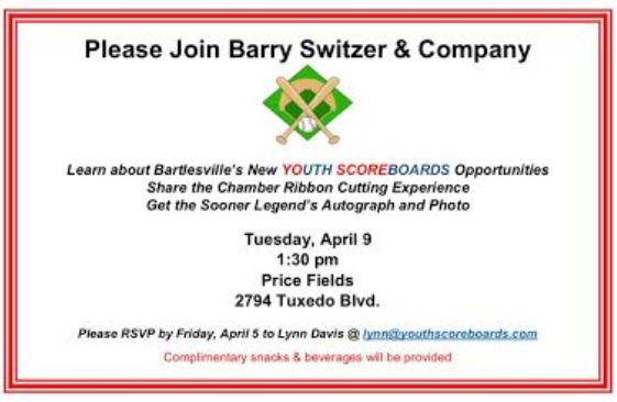 To attend the ribbon cutting, RSVP to Lynn Davis at lynn@youthscoreboards.com by April 5.
