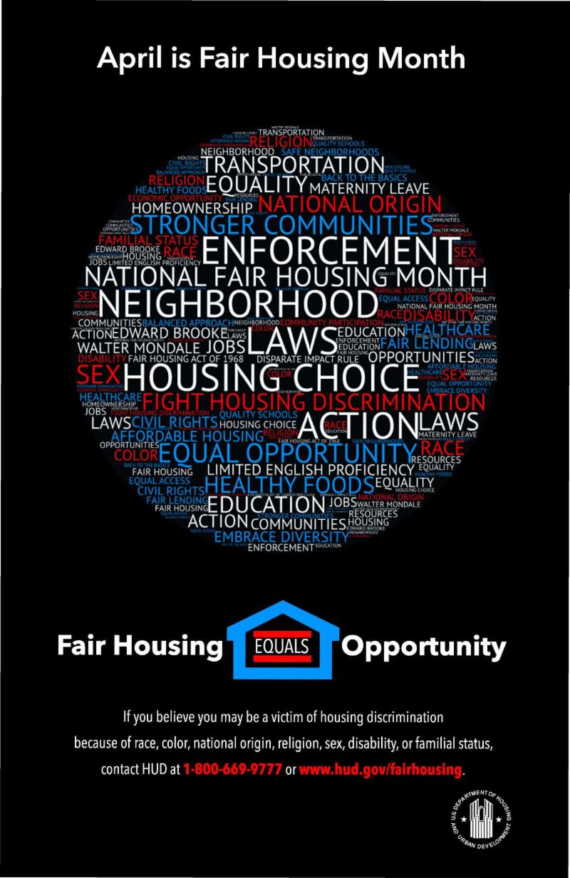 The City is also sharing information from the U.S. Department of Housing and Urban Development on our social media outlets to educate and inform the public on the importance of fair housing in community development and share information through posters and flyers during the month of April.