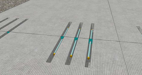 This illustration shows how a dowel joint retrofit is applied to a roadway. A dowel joint retrofit is planned as part of the rehabilitation project currently underway on Price Road between the roundabout and U.S. Highway 75.