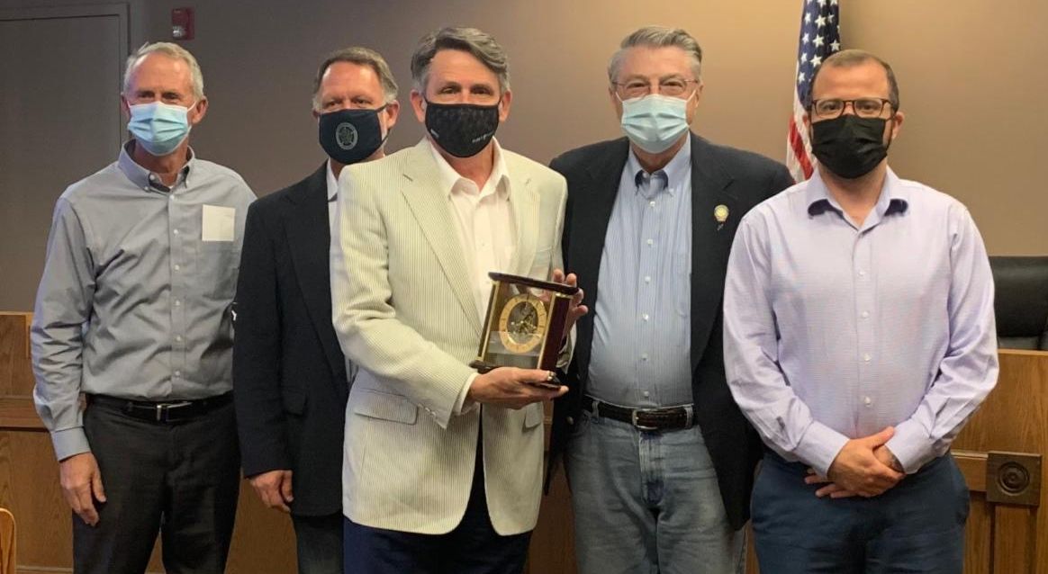 Municipal Judge and former Vice Mayor Alan Gentges, third from left, received a parting gift following his years of service on the City Council during a council meeting on Monday. From left, Vice Mayor Jim Curd, Ward 5 Councilor Trevor Dorsey, Mayor Dale Copeland and Ward 2 Councilor Paul Stuart were on-hand to thank Gentges for his service. "He was always there and was always working, not just at council meetings but before, during and after those meetings," said Copeland. "We talked often, and I valued his wisdom, his insight and advice as he helped guide the city. He did a tremendous job."