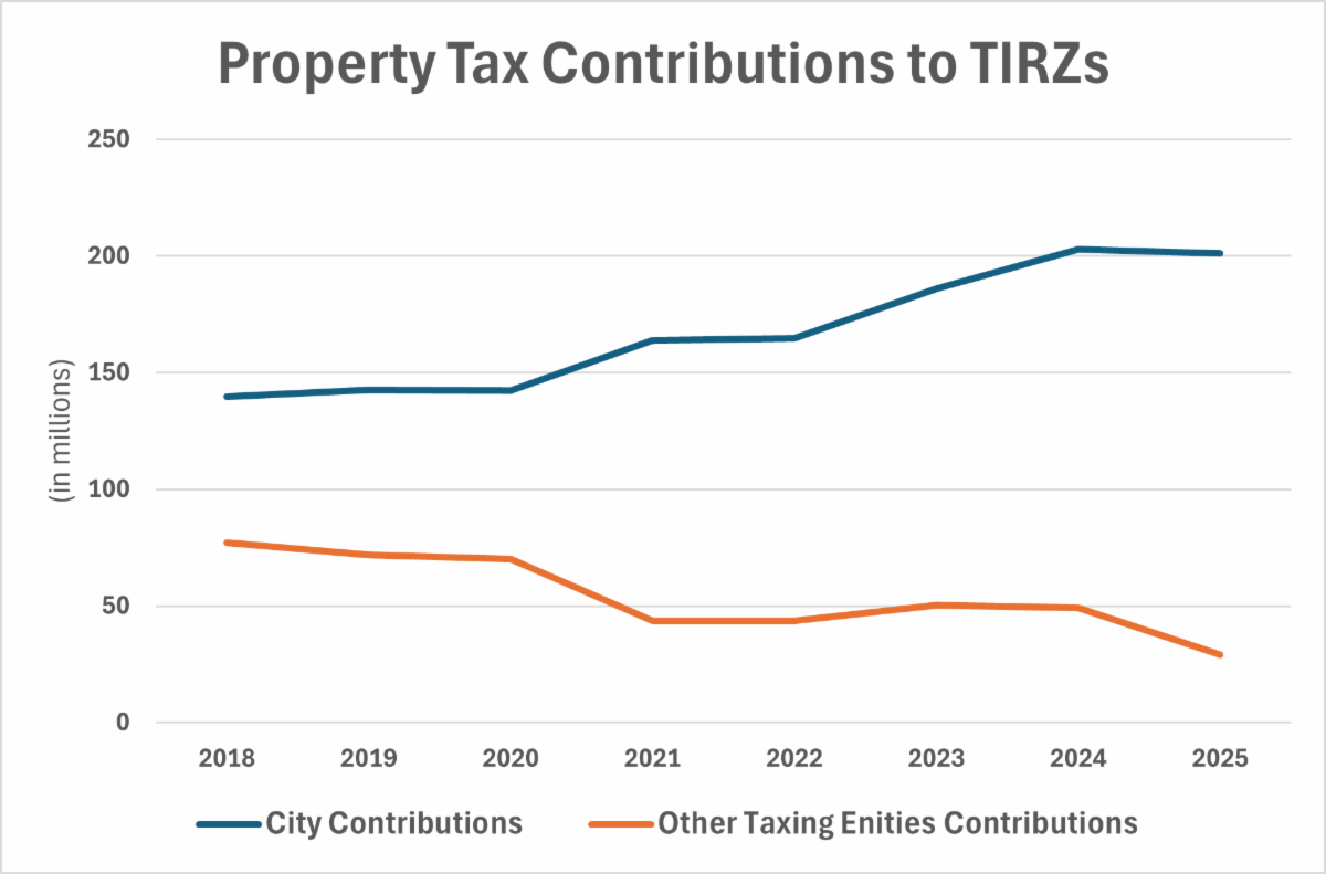 Second, it is interesting that taxing entities other than the City have been steadily reducing their participation. There are likely two reasons for that. First, they see no benefit from their participation. Second, and probably more importantly, their taxpayers have not imposed a property tax revenue limitation, so they have no motivation to create a subterfuge to duck the taxpayers' wishes.