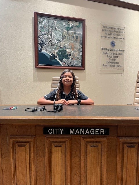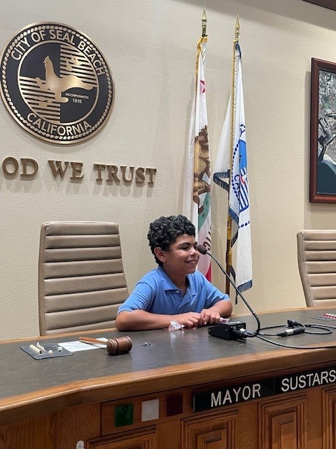 The City of Seal Beach was honored to host young leaders Ellis and Jonathan as our City Manager and Mayor for a Day. This extraordinary experience, made possible by Project SEEK, offered a unique opportunity to inspire the next generation of civic engagement. Two lucky McGaugh Elementary students, Ellis (pictured below, right) and Jonathan (pictured below, left), had an incredible experience exploring the heart of our City. Their whirlwind day as City Manager and Mayor was a testament to the power of civic engagement and the importance of inspiring our youth. From the moment they donned their official badges, Ellis and Jonathan immersed themselves in the role, gaining invaluable insights into the complexities of municipal government. Their tour encompassed a wide range of City departments, including Public Works, Finance, Community Development, City Clerk, Lifeguards, and a tour of the Police Substation. They met with dedicated staff, learned about essential services, and even had the opportunity to sit in the Mayor's and City Manager’s chair in the City Council Chambers to experience firsthand the responsibilities of leadership. The day culminated in a tour of our vibrant downtown area, where they toured Main Street businesses and were treated with ice cream for their efforts. Upon departure, the students were given a swag bag of City of Seal Beach mementos, and our staff was left with the impression that our future government was in good hands. Project SEEK is a remarkable organization that has been instrumental in enriching the lives of McGaugh Elementary School students for over three decades. Their commitment to fostering academic excellence and creating opportunities for local students to explore diverse career paths is truly commendable. The City of Seal Beach is proud to support Project SEEK's mission and looks forward to future collaborations that benefit our community.