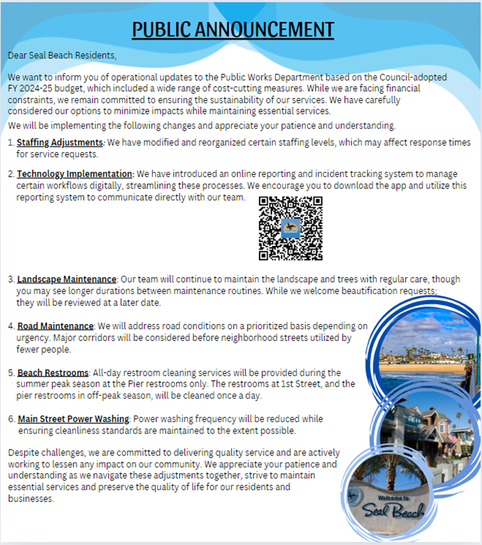 MySealBeach: Your City in the Palm of Your Hand. We now have an easier way to report a work request. The app allows you to report the issue directly to our utilities and maintenance teams. Scan the QR Code below and be part of ensuring that Seal Beach remains a great place to live.