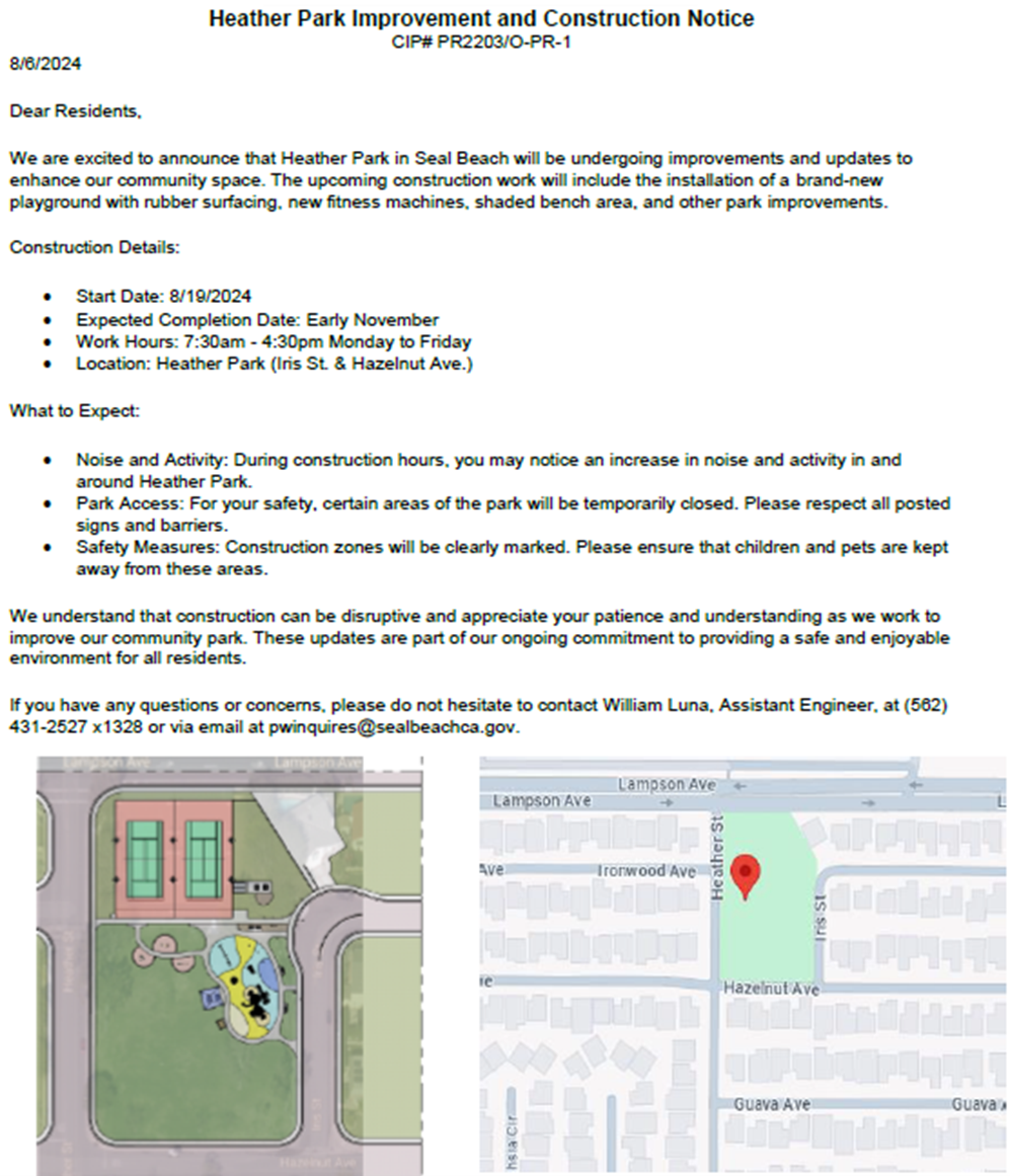 Public Works is excited to announce that the much anticipated renovations for Heather Park will begin on August 19, 2024. Please see below for the Construction Notice.