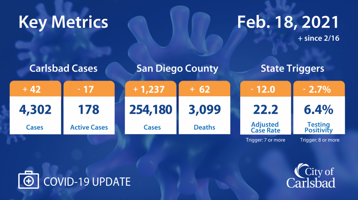 I know it can sometimes feel like two steps forward, one step back, but we really are making progress toward a return to some kind of normalcy. With another new vaccine on the way and the expanded infrastructure in place to administer vaccines, the light at the end of this tunnel is getting brighter every day. Thank you for hanging in there, and thank you for continuing to #Care4Carlsbad.