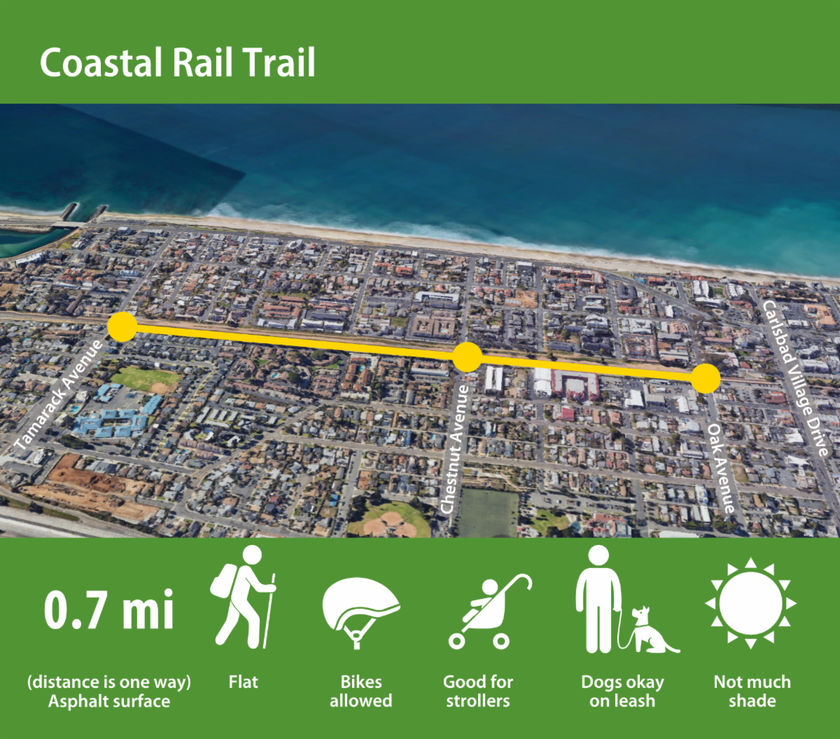 This segment is part of the city’s 67-mile trail system, which includes everything from quiet nature paths to convenient routes that connect neighborhoods, parks and schools. The Coastal Rail Trail is also part of a larger regional trail planned to eventually connect Oceanside to downtown San Diego.