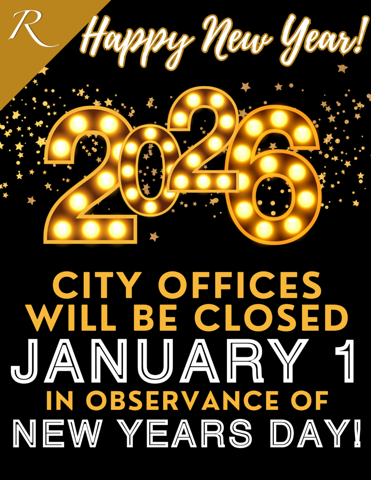 City offices will be closed on Thursday, Jan. 1, 2026, in observance of the New Year holiday. Regular business hours will resume on Friday, Jan. 2, 2026.