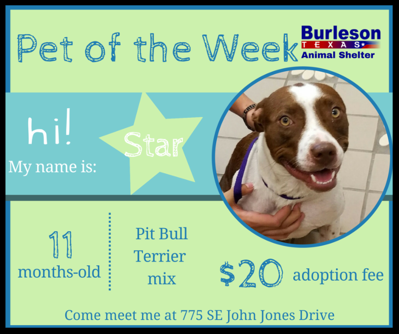 Meet Star, an eleven-month-old female Pit Bull Terrier mix. She is a sweet girl and likes other dogs. Star was returned to the shelter because the resident dog didn't like her and her owner was afraid she was going to be harmed. The previous owner stated she was a great dog and he hated having to return her. She has been spayed, housebroken and all her vaccines are complete. She is ready for her forever home and her adoption fee is only $20.00. Come meet her today at the Burleson Animal Shelter.