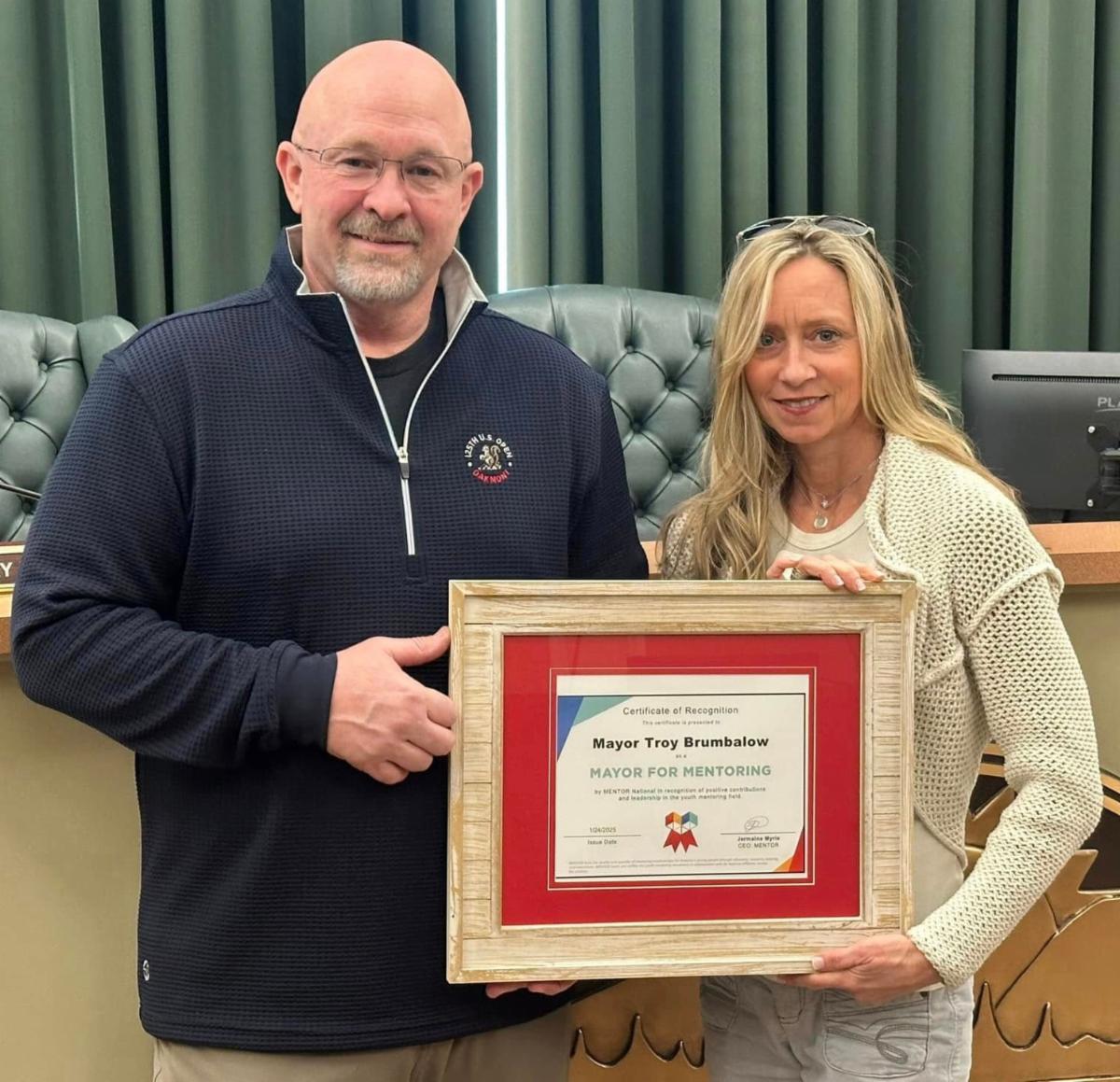 Mayor Troy Brumbalow has been honored by MENTOR National as a "Mayor for Mentoring". He was nominated for this recognition by Mentor Me North Georgia thanks to his support of local mentoring programs. Mentor Me North Georgia leaders said they wanted to recognize Mayor Brumbalow, pictured here with Kerry Carithers, executive director of Mentor Me, for his "outstanding commitment to youth mentorship in our community," adding that "his dedication to partner with Mentor Me North Georgia and advocating for the power of mentoring will make a lasting impact on the youth we serve." Congratulations to Mayor Brumbalow on receiving this honor!