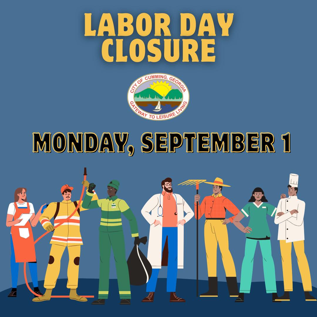 Most City of Cumming non-essential departments and facilities will be CLOSED in observance of Labor Day on Monday, Sept. 1st.
