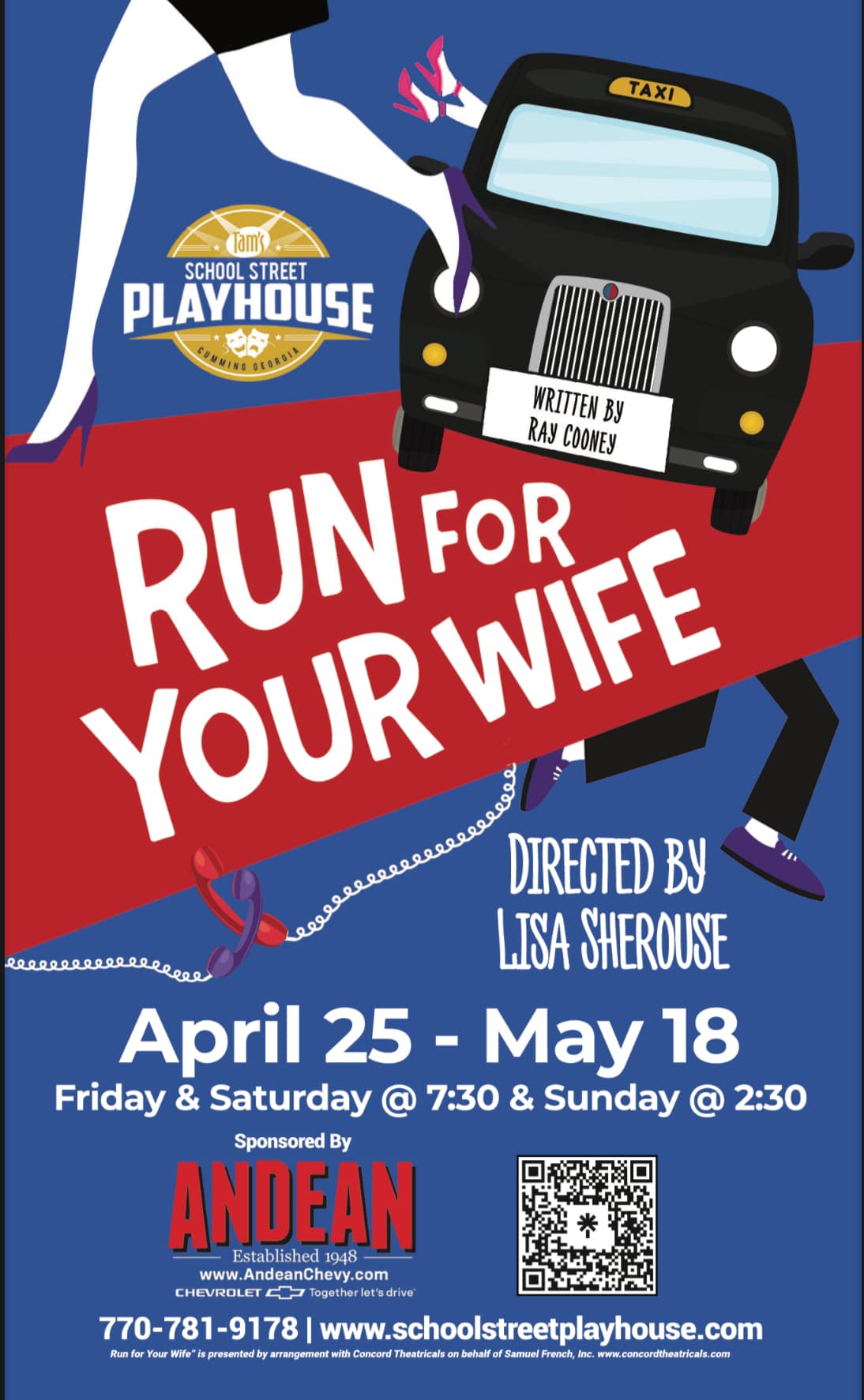The School Street Playhouse brings another hilarious British comedy to the stage beginning on April 25th. "Run for Your Wife" by famed British playwright Ray Cooney centers around John Smith, an "ordinary" London taxi driver who secretly has two wives in two different towns. After an accidental head injury leaves John confused and off his intricate schedule, complication is piled upon complication as he tries to hide his double life from both wives, neighbors, and the police. Hilarity ensues as the plot continues to thicken - and then thicken some more.