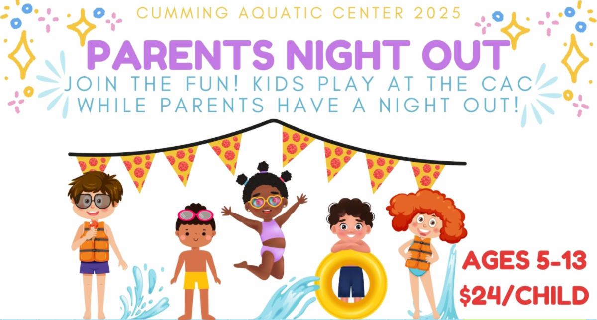 Cumming Aquatic Center Parents Night Out will be held April 11th from 6-10 p.m. This fun evening of swimming, games and a pizza dinner is open to kids ages 5 to 13 and costs $24 per child. Parents, drop off the kids and enjoy date night!