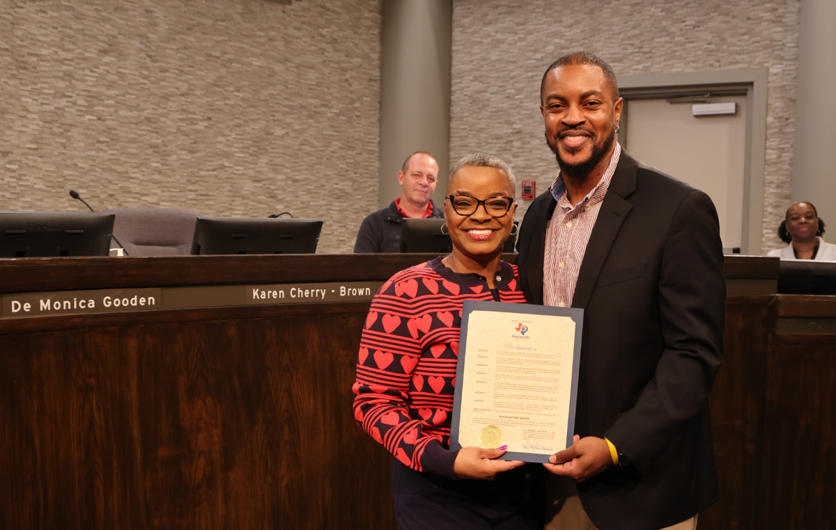 Mayor Pro Tem DeMonica Gooden presents Assistant Director of Parks and Recreation Tyler Agee with a proclamation recognizing Black History Month during the February 3, 2026, Regular Meeting of the Duncanville City Council.
