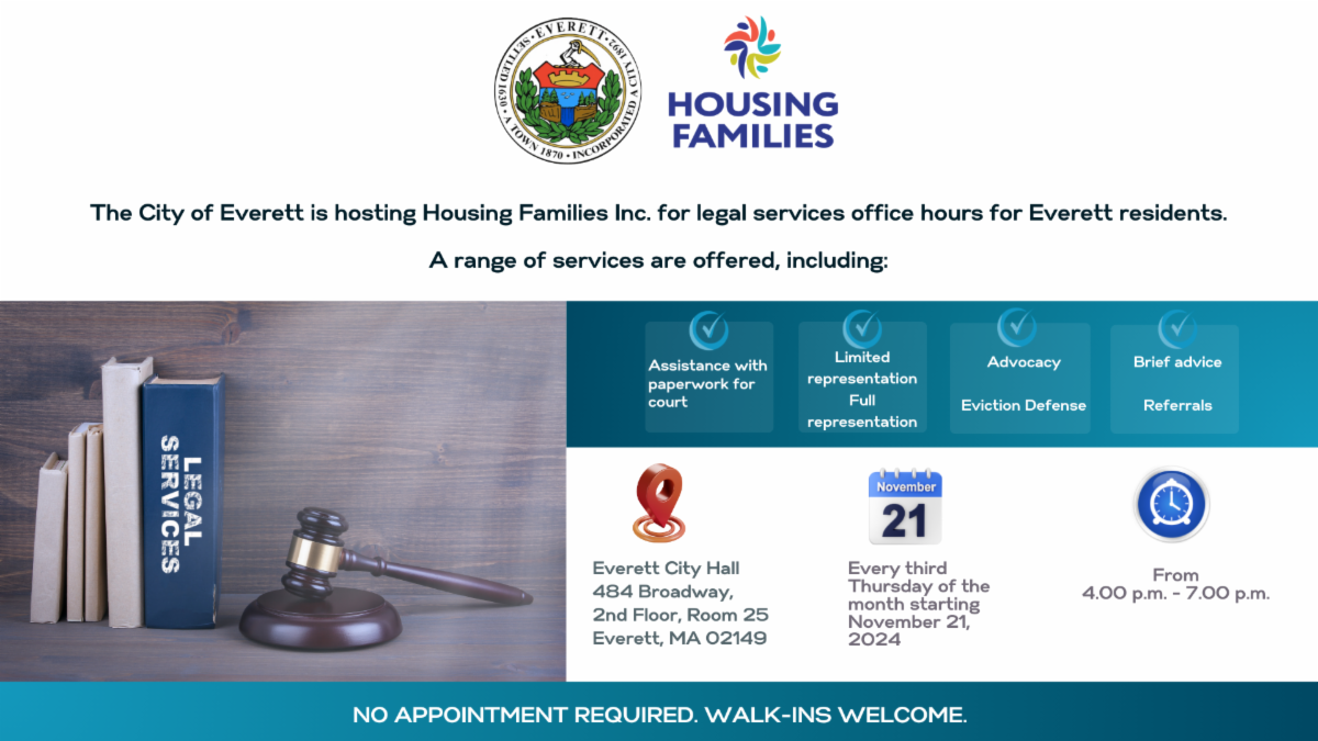 The City of Everett is hosting Housing Families, Inc. for legal services office hours for Everett residents every third Thursday of the month from 4:00 p.m. to 7:00 p.m. at Everett City Hall (484 Broadway, Everett, MA 02149) on the second floor, Room 25.
