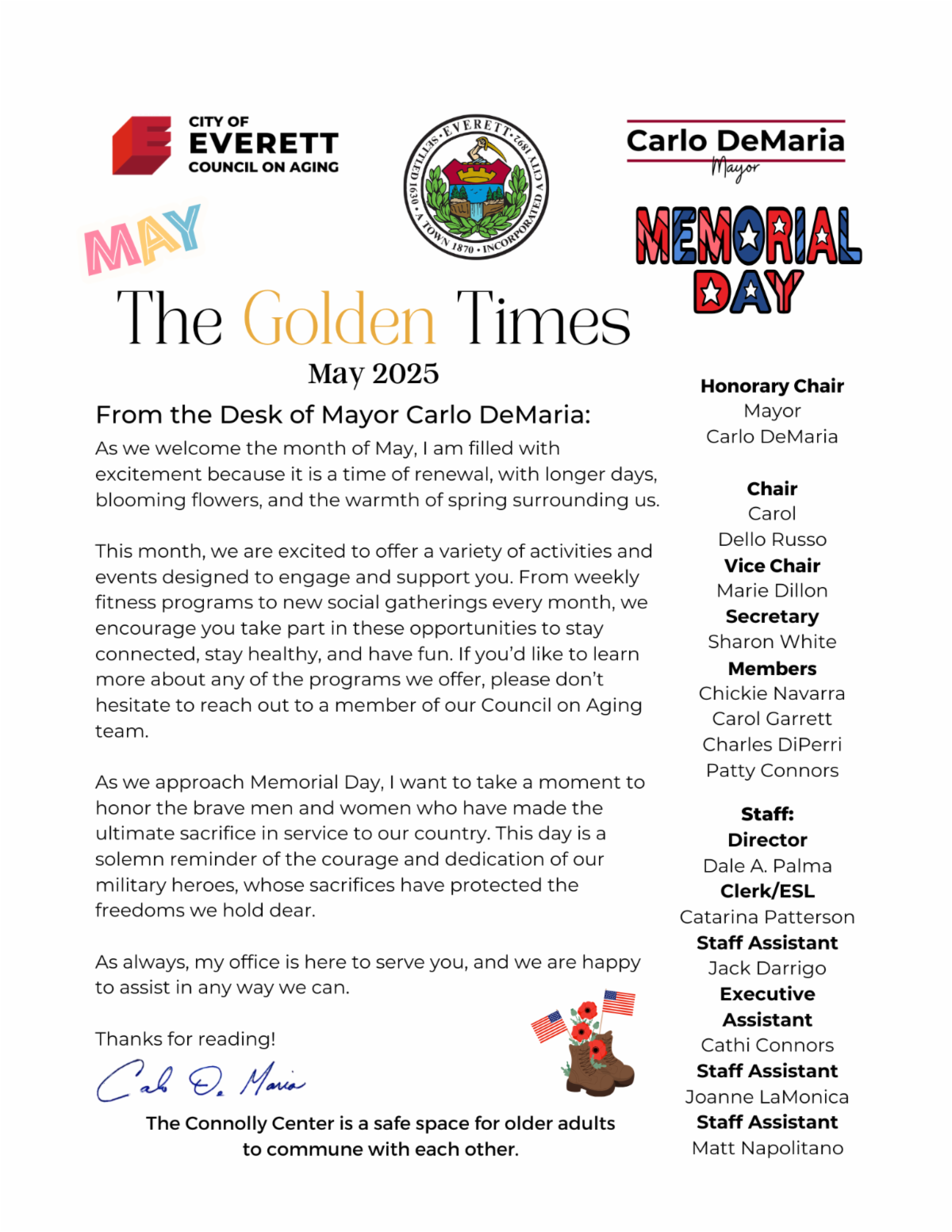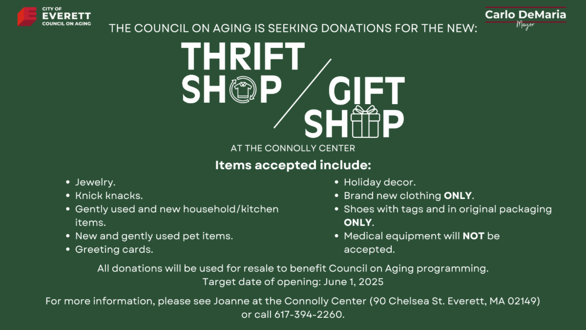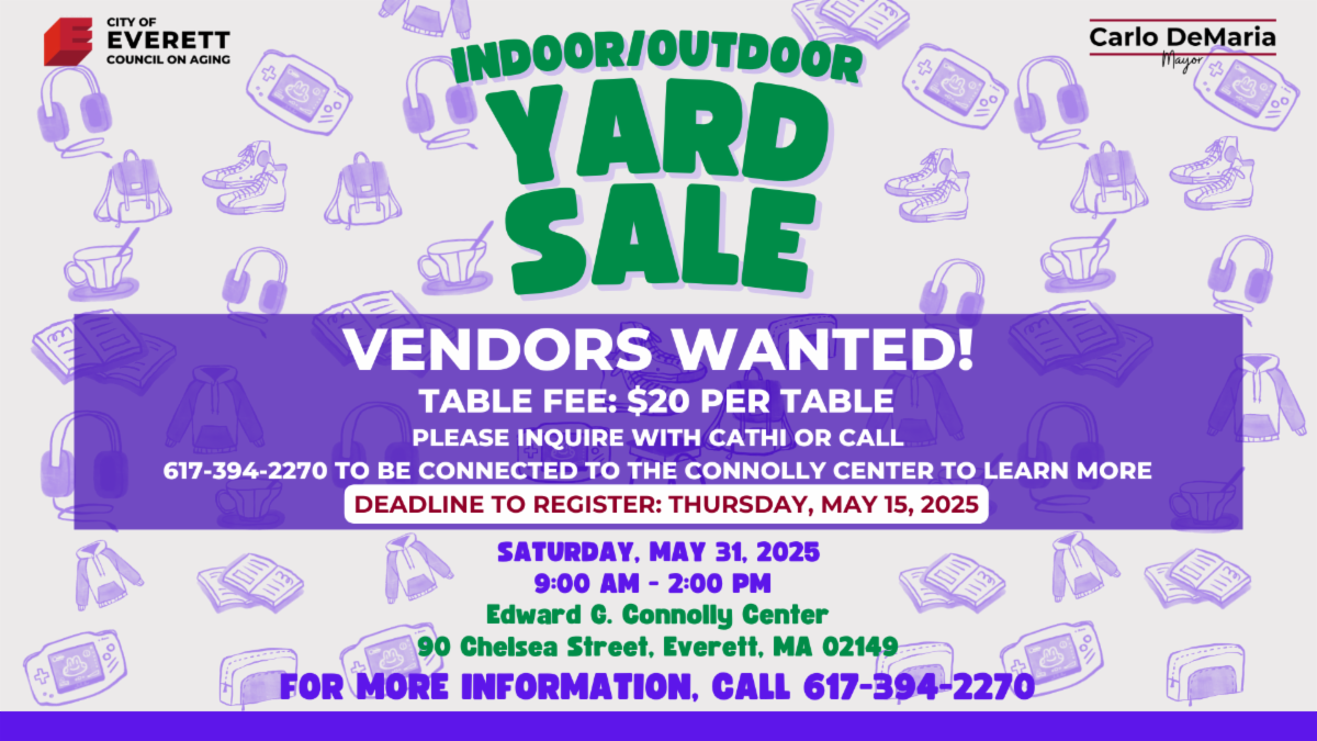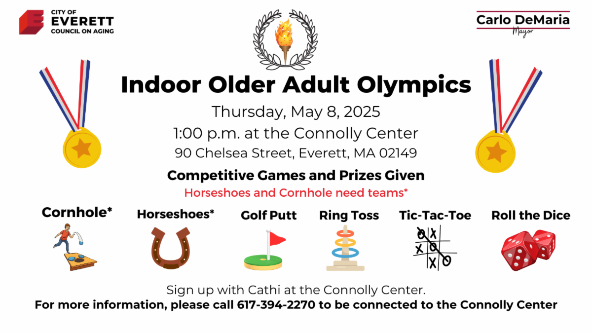 | | The Council on Aging is seeking vendors for the upcoming Indoor/Outdoor Yard Sale event! For more information and to reserve a table, please inquire with Cathi by dialing 617-394-2270 to be connected to the Connolly Center. The deadline to register is Thursday, May 15, 2025. | | The Council on Aging is seeking donations of items for the new Thrift Shop/Gift Shop at the Connolly Center set to open on June 1. All donations will be used for resale to benefit COA programming. For more information, please dial 617-394-2260. | | Indoor Older Adult Olympics | | Take on the challenge of six featured games at the Council on Aging's Indoor Older Adult Olympics! Please sign up with Cathi at the Connolly Center. For more information, please dial 617-394-2270 to be connected to the Connolly Center. | | Looking to learn something new or begin a new activity? The Council on Aging offers a variety of programming for older adults every week! | | Check out the latest edition of the Golden Times to view all of the exciting programming the Council on Aging has in store for Everett's older adults! | | Diversity, Equity, and Inclusion | | |
