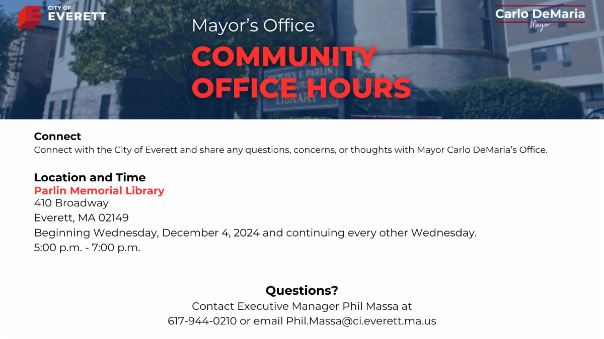 | | Mayor's Office Community Office Hours | | A Chance for Residents to Meet with the Mayor's Office | | Want to share questions, concerns, or thoughts with the City of Everett? Connect with the Office of Mayor DeMaria at the Parlin Memorial Library from 5 p.m. to 7 p.m. every other Wednesday. To know when the next office hours will be held, please visit the City of Everett's online calendar. Questions? Call 617-944-0210 or email Phil.Massa@ci.everett.ma.us. | | Legal Services Office Hours for Everett Residents | | Office hours take place every third Thursday of the month | | |