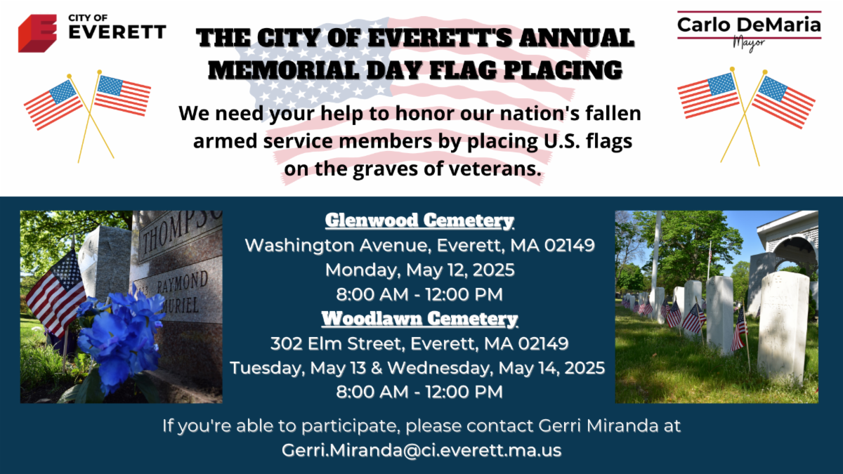 Mayor Carlo DeMaria is pleased to announce that the City of Everett has planned three days to place U.S. flags on the graves of veterans at Glenwood and Woodlawn cemeteries in preparation for Memorial Day.