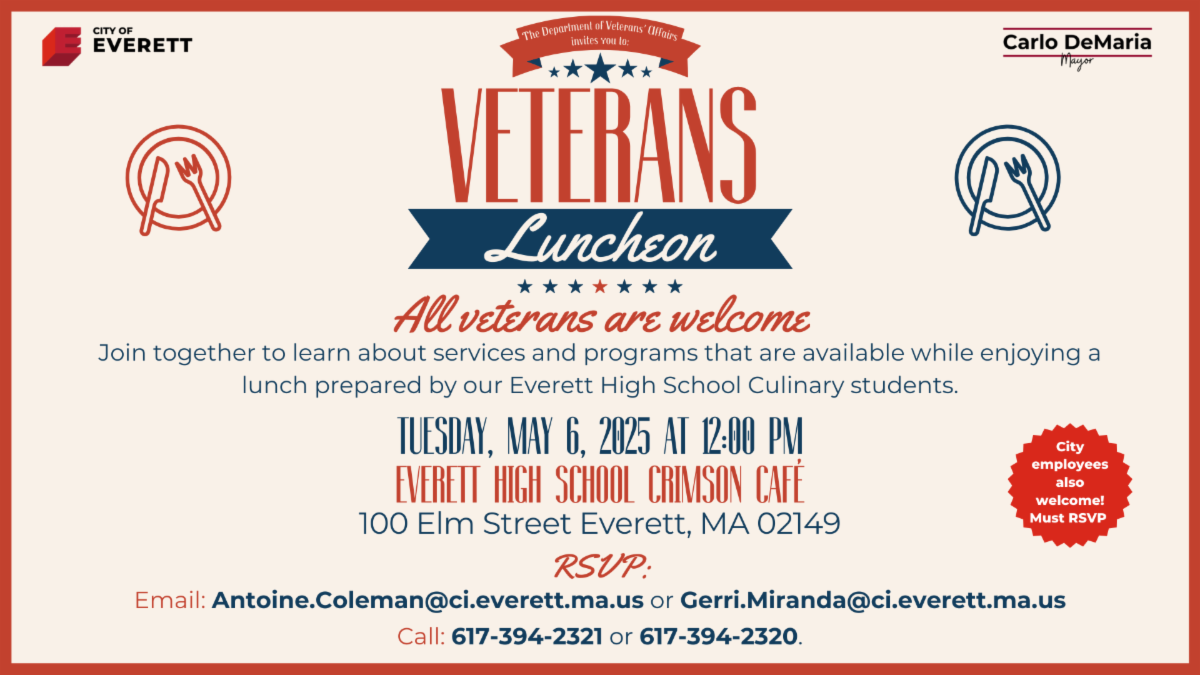 Mayor Carlo DeMaria and the City of Everett’s Department of Veterans’ Affairs invite all veterans to a luncheon at Everett High School’s Crimson Café.