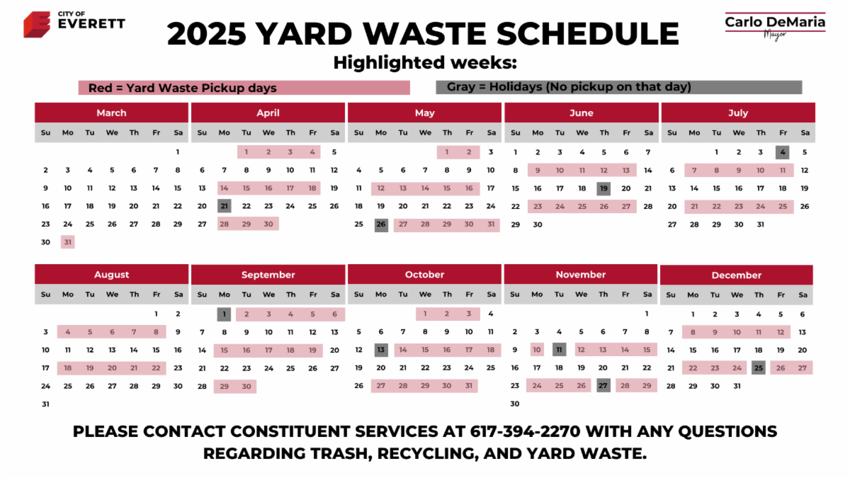 Mayor Carlo DeMaria is pleased to announce the City of Everett’s 2025 yard waste pickup schedule. Every year, the City is proud to offer this service as an option for residents to keep their properties neat and tidy. This year’s schedule will begin in March and end in December.