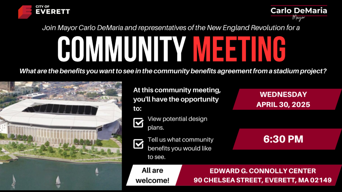 Those who attend will be able to view potential design plans and learn more about the potential stadium project in a presentation by representatives of the New England Revolution. Additionally, those who attend will have the opportunity to share with Mayor DeMaria and his team what community benefits they would like to see in the community benefits agreement from the potential stadium project.