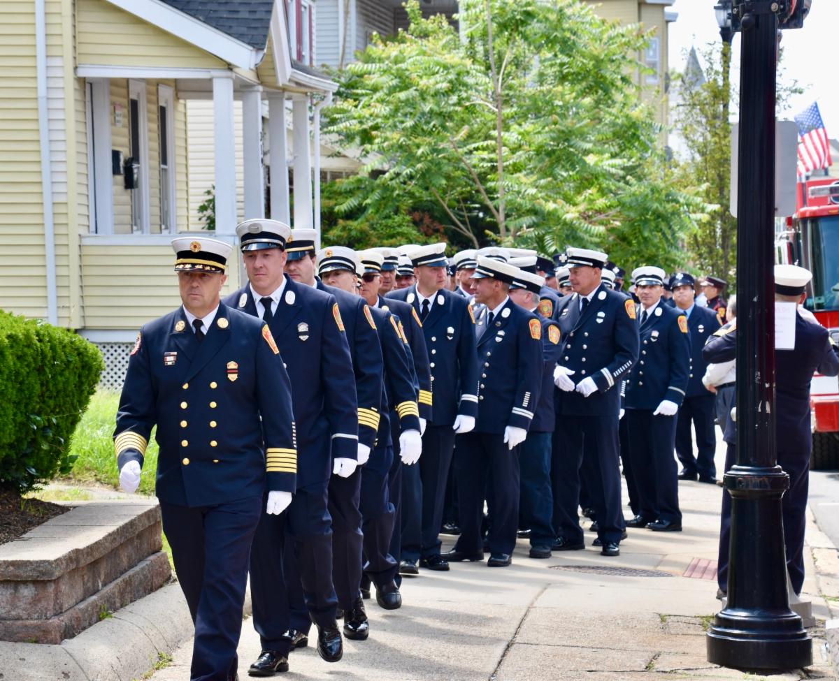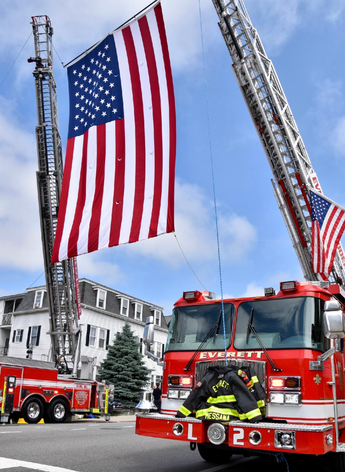 Everett firefighters joined alongside police officers from the Everett Police Department to line up for a procession led by Fire Chief Joseph Hickey to walk through and pay their respects. The Everett Fire department also draped a large American flag over Main Street in honor of their departed colleague.