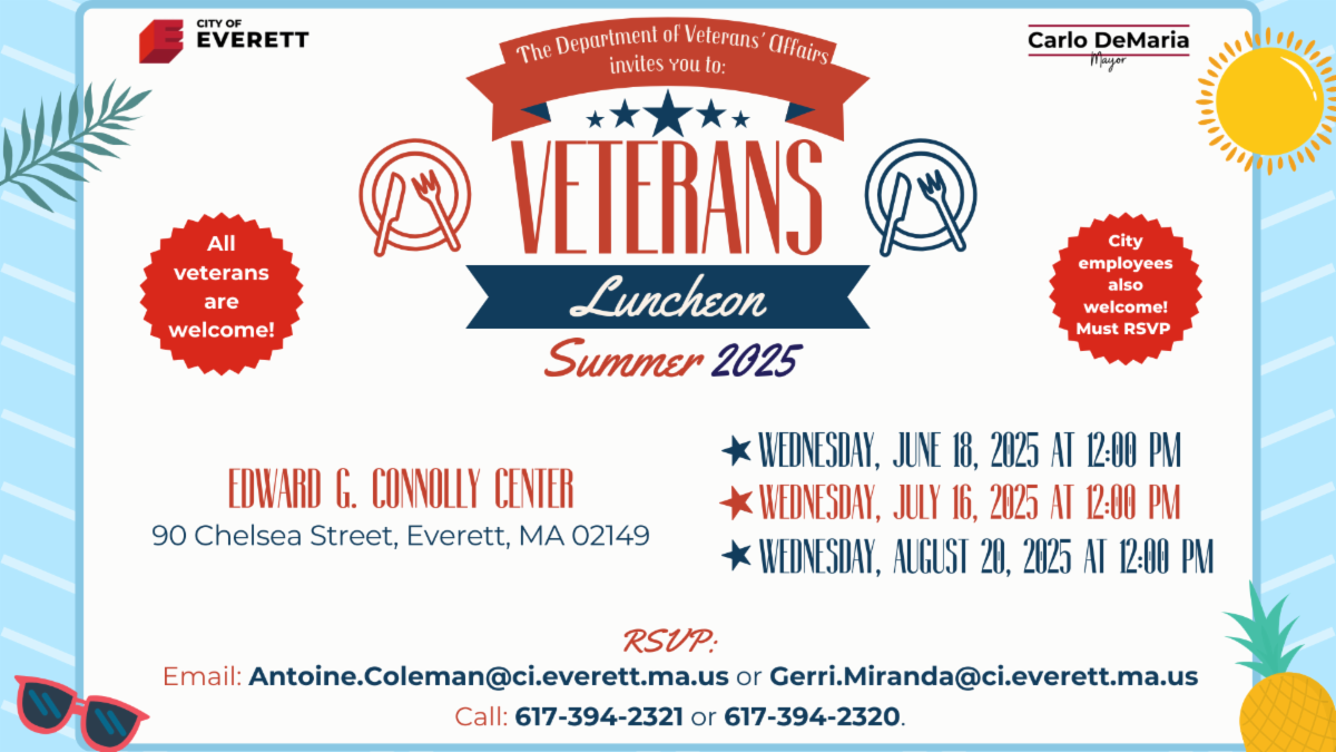 Mayor Carlo DeMaria and the City of Everett’s Department of Veterans’ Affairs invite all veterans to a series of luncheons at the Edward G. Connolly Center.
