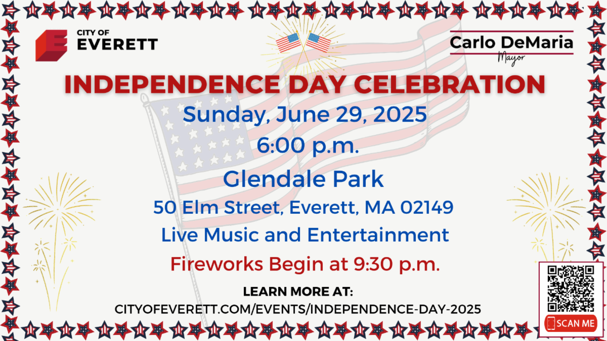 Mayor Carlo DeMaria is pleased to announce that the City of Everett’s annual Independence Day Celebration will be held on Sunday, June 29, beginning at 6 p.m. at Glendale Park (50 Elm Street).
