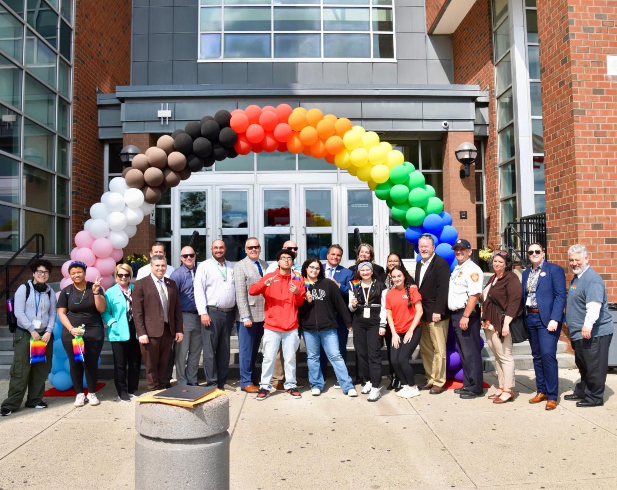 Mayor Carlo DeMaria recently joined students, educators, and staff, along with members of the Everett School Committee and City Council, at Everett High School to raise the Pride flag in celebration of Pride Month.