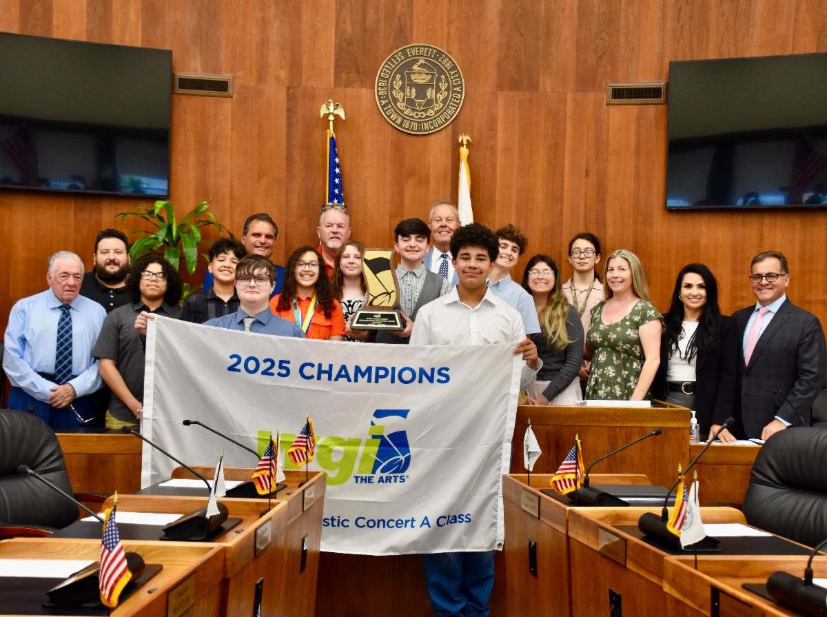 Mayor Carlo DeMaria recently congratulated the Everett High School Crimson Tide Percussion Ensemble (CTPE) for finishing first place in the Concert A division at the 2025 WGI World Championships in Dayton, Ohio.
