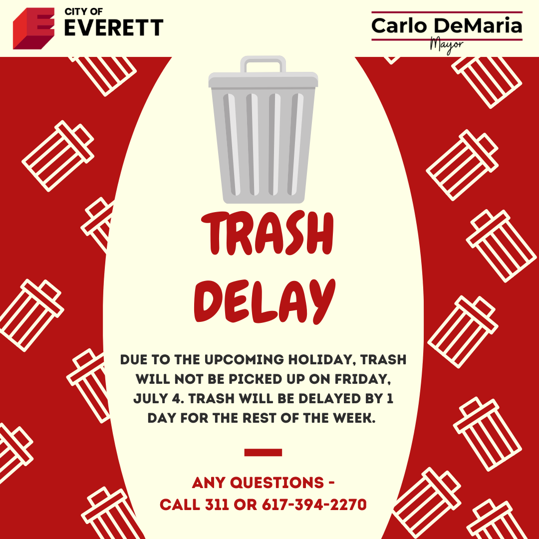 Due to the Independence Day holiday falling on Friday, July 4, trash and recycling will not be picked up on Friday, July 4 and will be delayed for the rest of the week. If your regularly scheduled collection day is Friday, please neatly place your trash and recycling bins curbside on Saturday for this week only. Please note that trash and recycling pickup prior to Friday will not be affected.