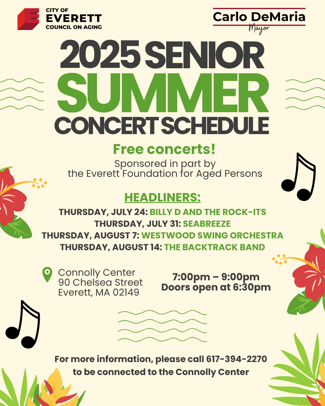 Mayor Carlo DeMaria and the City of Everett’s Council on Aging invite you to the 2025 Senior Summer Concerts! Enjoy live music and warm evenings in good company. Doors open at 6:30 p.m.