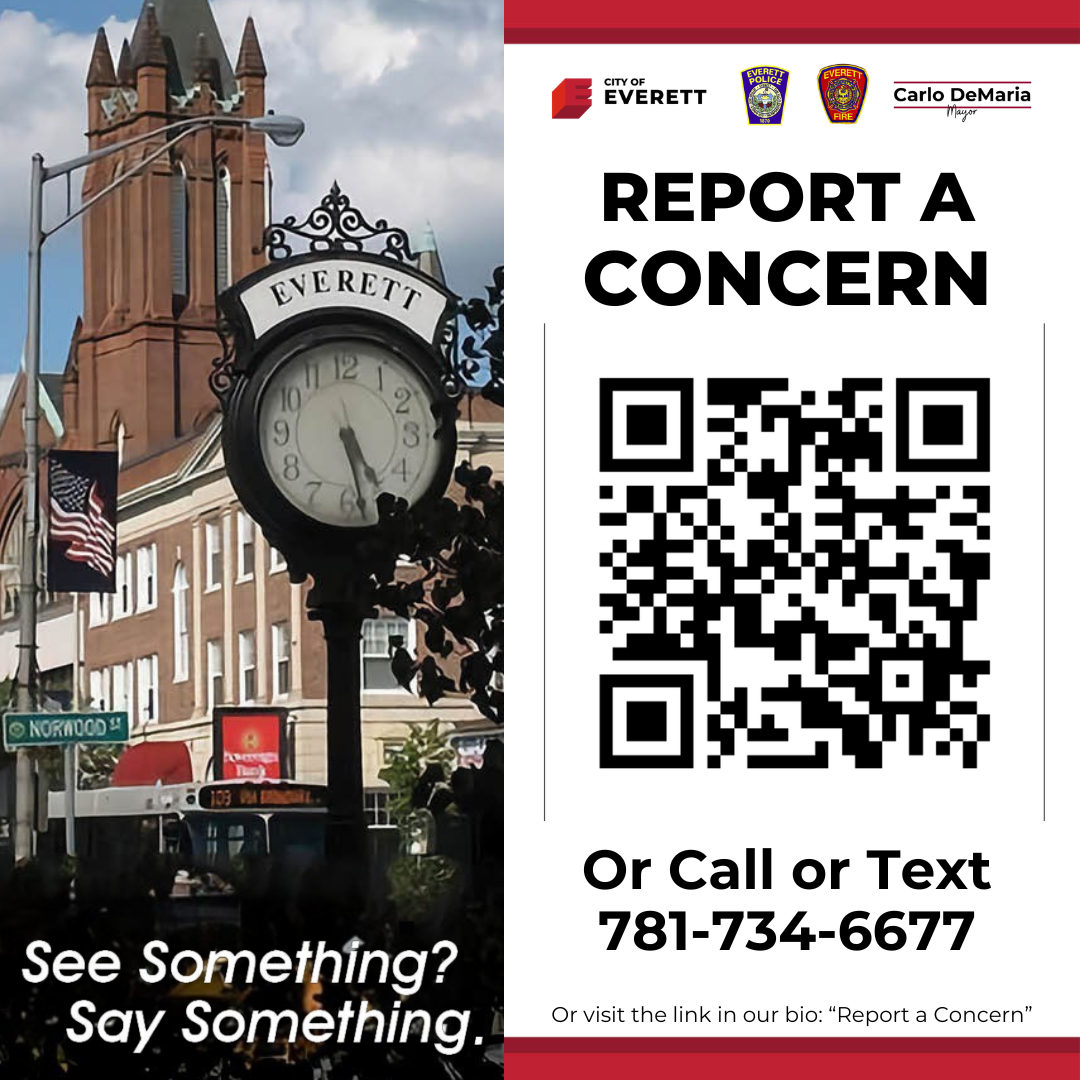 In an effort to increase accessibility to City services, constituents can now report concerns or issues such as noise complaints, property damage, litter or graffiti, wellness checks, and more to the Everett police by calling or texting 781-734-6677. Additionally, reports can be made online by visiting go.elerts.com/Everett and filling out the form. Before submitting a report, the constituent will be asked about the nature and location of the report, as well as have the option to include a photo.