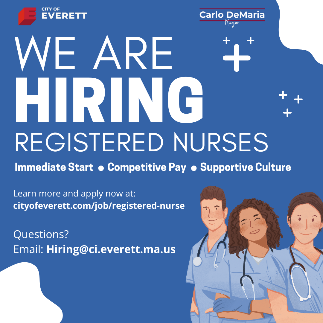 The City of Everett is seeking Registered Nurses! If you, or someone you know, is looking to begin their career in nursing or is looking for a career change, check out the opportunities available with the City of Everett. Please reach out to our Human Resources Department if you have any questions or would like to learn more by emailing: Hiring@ci.everett.ma.us. We're looking forward to hearing from you!