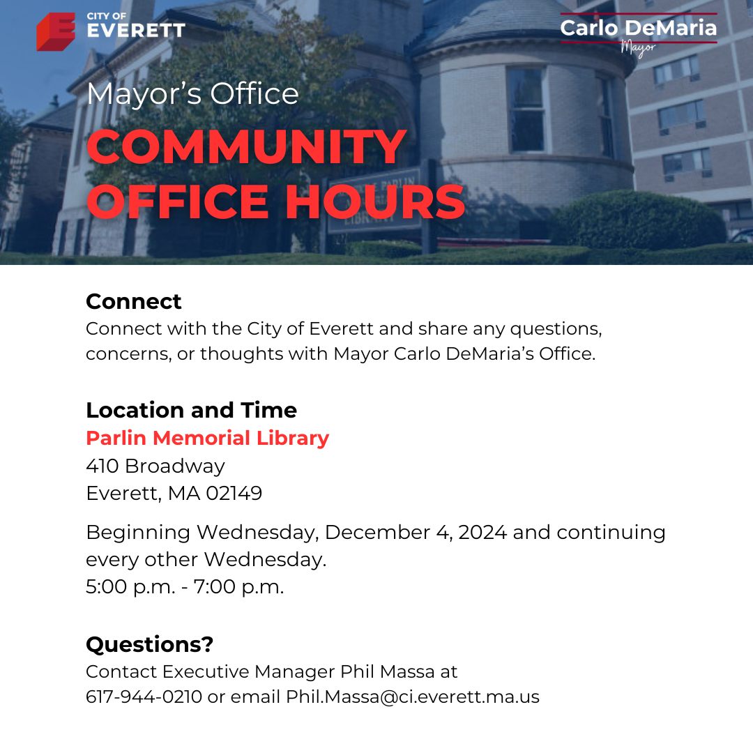 Want to share questions, concerns, or thoughts with the City of Everett? Connect with the Office of Mayor DeMaria at the Parlin Memorial Library from 5 p.m. to 7 p.m. every other Wednesday. To know when the next office hours will be held, please visit the City of Everett's online calendar. Questions? Call 617-944-0210 or email Phil.Massa@ci.everett.ma.us.