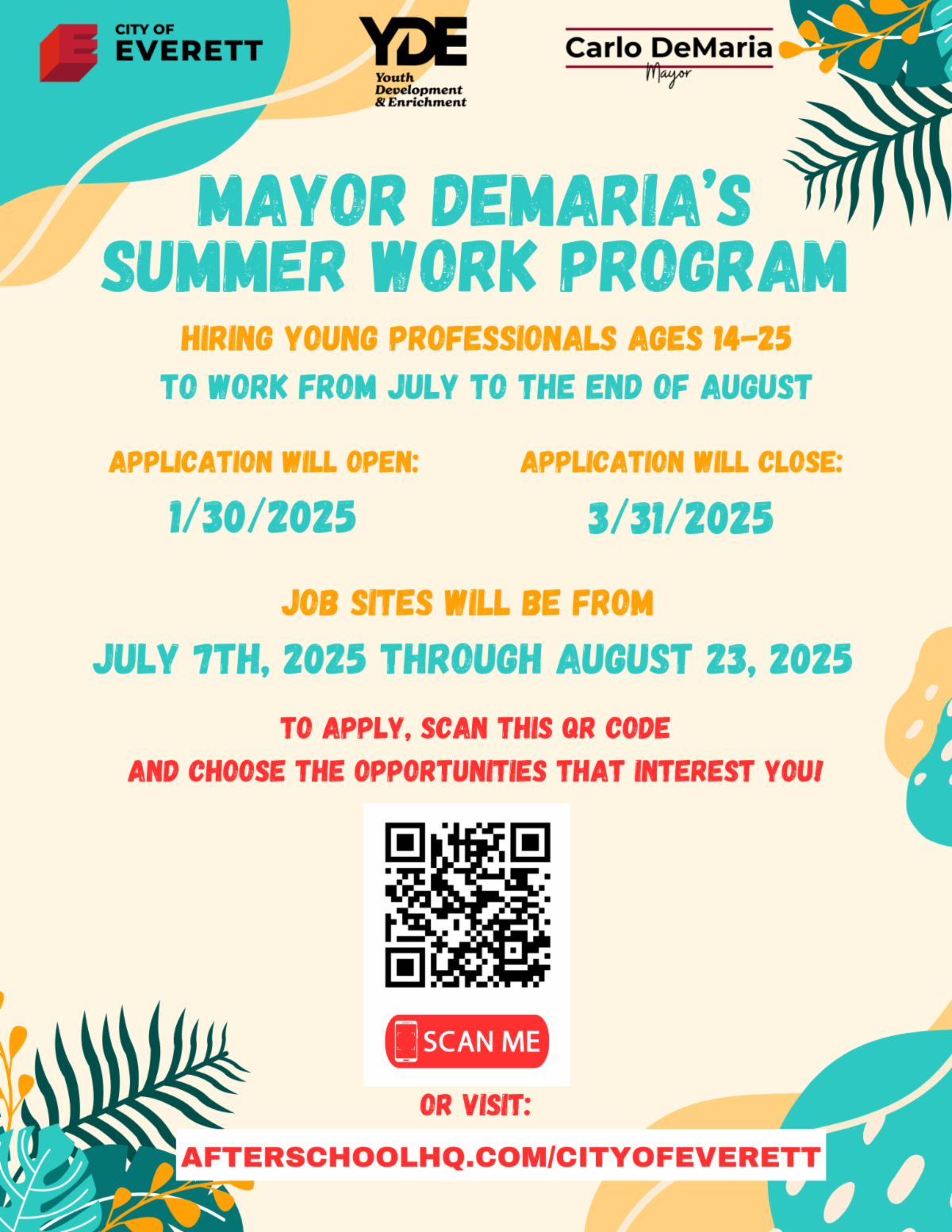 Applications for Mayor DeMaria's Summer Work Program are now open! Young professionals ages 14-25 are encouraged to apply for a variety of job sites that will begin on July 7 and end on August 23. Don't wait to apply because space is limited and the deadline is March 31. To view the available opportunities and to apply, please click the button below to visit Afterschoolhq.com. | |