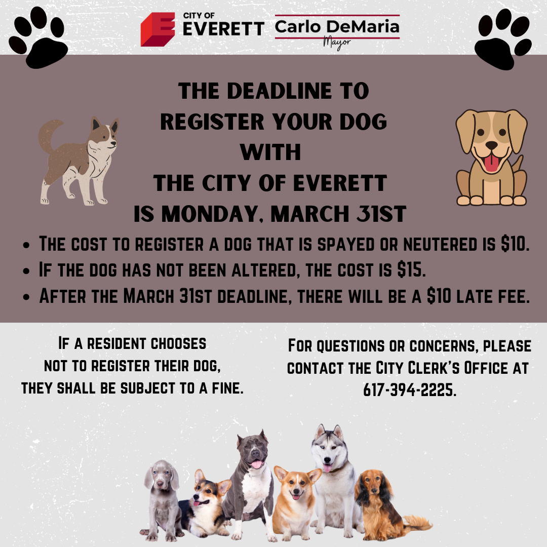 The Office of the City Clerk would like to remind residents that the deadline to register a dog with the City of Everett is Monday, March 31. Registering your dog after the deadline will result in a $10 late fee.