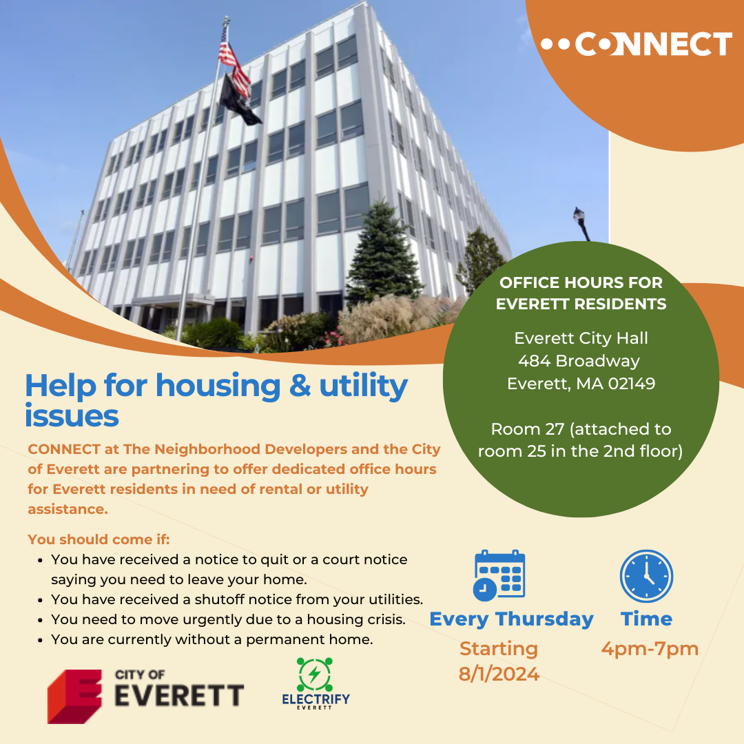 CONNECT at the Neighborhood Developers and the City of Everett have partnered to offer dedicated office hours for residents in need of rental or utility assistance every Thursday from 4:00 p.m. to 7:00 p.m. at Everett City Hall (484 Broadway) in Room 27, which is attached to Room 25 on the second floor.