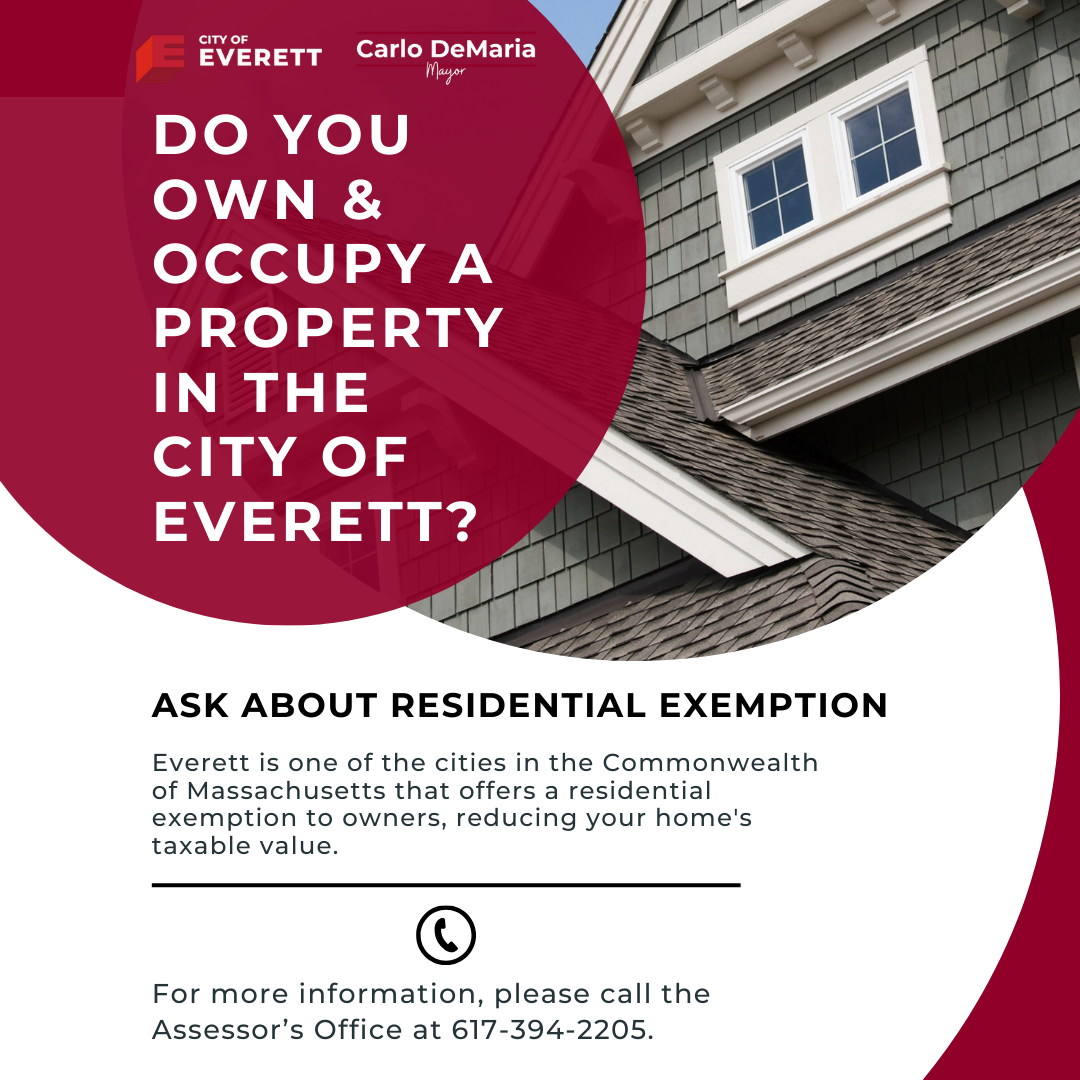 Did you know that Everett is one of the cities in the Commonwealth of Massachusetts that offers a residential exemption to owners, reducing your home's taxable value? Ask about residential exemption and learn more by contacting the Assessor's Office at 617-394-2205.
