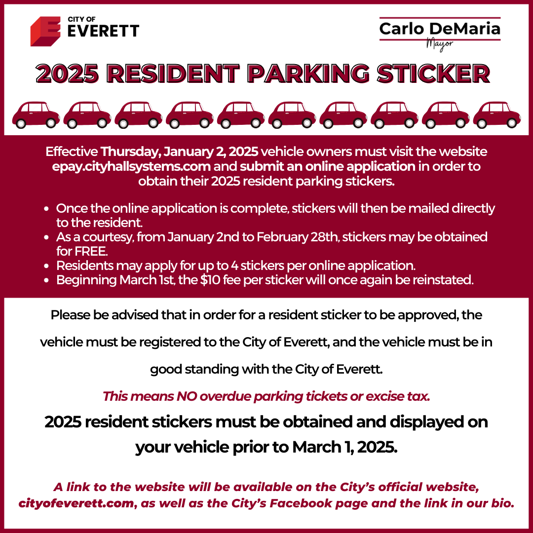 As we start fresh in the new year, we have some new and recurring initiatives that are important to note. First, don't forget to apply for a new resident parking sticker before February 28 to receive one for free. Second, Homeowners can contact our Assessor's Office to ensure you are taking advantage of a program that can reduce your home's taxable value. Lastly, be sure to stop by the Parlin Memorial Library every other Wednesday to meet with staff from my office and discuss any questions, concerns, or thoughts you may have. More information about all of these opportunities are below.