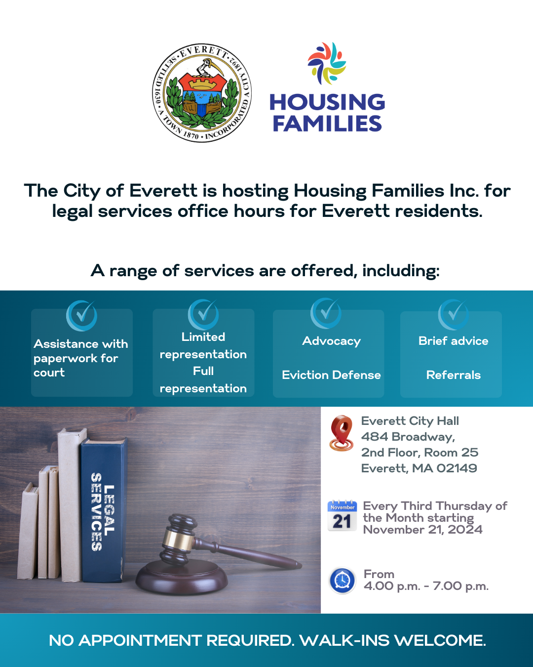 The City of Everett is hosting Housing Families, Inc. for legal services office hours for Everett residents every third Thursday of the month from 4:00 p.m. to 7:00 p.m. at Everett City Hall (484 Broadway, Everett, MA 02149) on the second floor, Room 25.