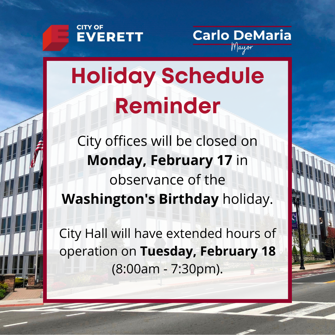 City offices will be closed to the public on Monday, Feb. 17, as Everett observes the Washington’s Birthday holiday. City offices will re-open on Tuesday, Feb. 18, and City Hall will have extended hours for residents (8 a.m. to 7:30 p.m.).